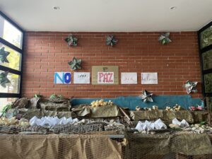 Instalación Artística creada por el alumnado de 2ESO, en la asignatura de EPV y A. “SIN JUSTICIA NO HAY PAZ” Movimiento educativo contra el genocidio de Palestina.